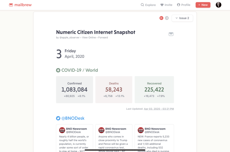 Mailbrew is a new service in the category of information aggregators that allows users to build and receive newsletters automatically to their mailbox. Newsletters are based on content sources like RSS feeds, Twitter, Google News, Reddit, just to name a few.