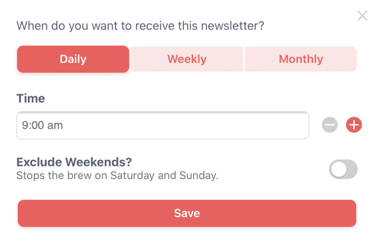The building process if very strait-forward: a newsletter is generated from a brew. You start by giving it a name and a publishing schedule. Scheduling options are flexible: the newsletters can be sent on a daily, weekly or monthly basis.