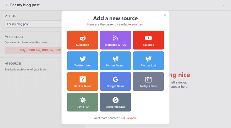 There is an infinite number of ways that you can build your newsletters. They can be subject-specific or source-specific or both at the same time. It is really up the user and this is the beauty of this service. For example, if you are a big user of Reddit, you can build a newsletter based on your favourite subreddits. Or, if you are a fan of Apple, newsletters can be based on many of your favourite websites about Apple and add Apple pundits from Twitter.