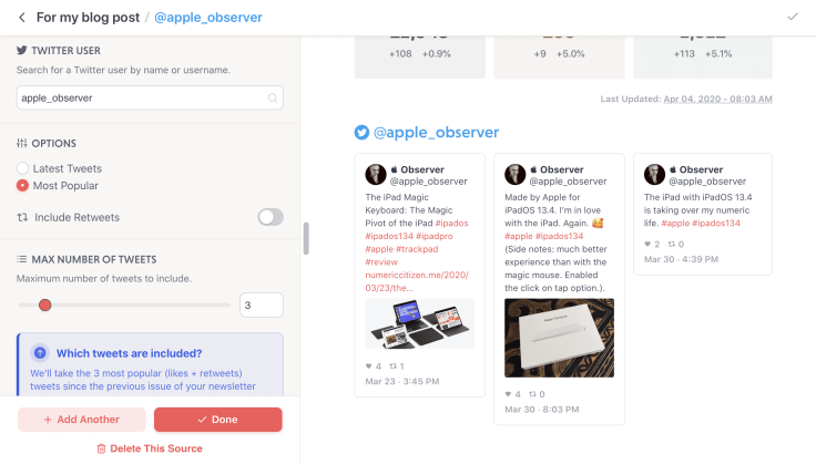 Twitter searches are supported and prove to be both very powerful and useful. For example, I set up a newsletter to search for very specific tweets about Apple’s upcoming products like iPadOS 14 and iOS 14. I get this newsletter once a week, on Saturday morning. Working with Mailbrew is really like having a digital assistant doing work for you, repeatedly, diligently. I love this.
