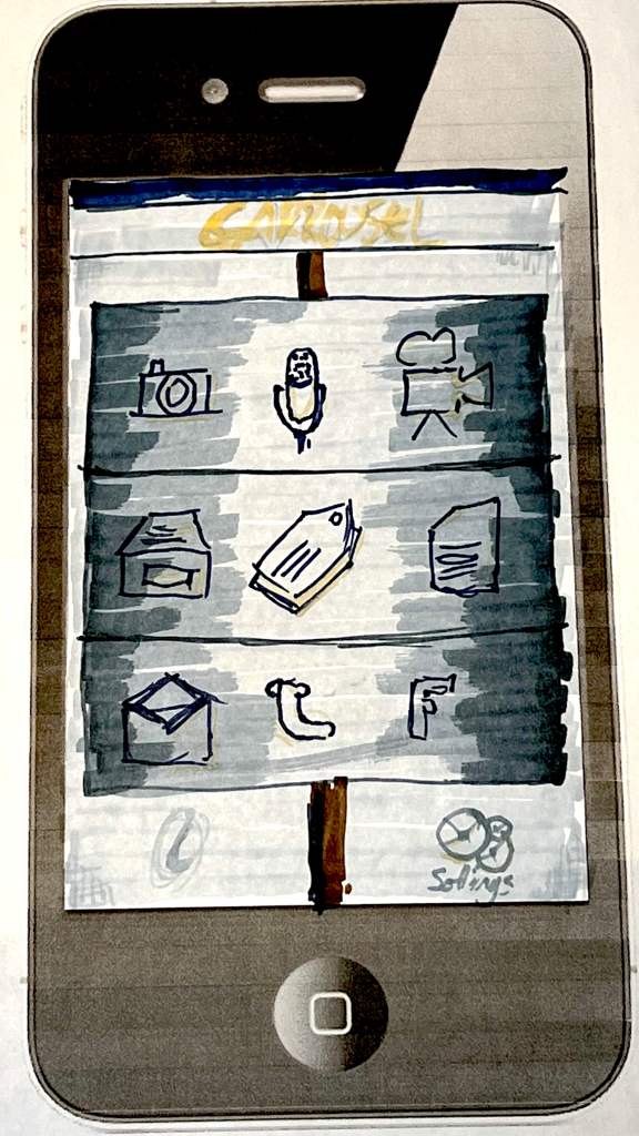 The design elements at the center of my Carousel app were three rotating circular cylinders. Each cylinder had a specific row of icons for a designated set of available actions. The top row was the “capture” cylinder. The user could rotate the cylinder and stop at specific action, for example, the camera icon. The middle cylinder was the action row where the user could save, tag, and file the digital element he was about to take (from the top cylinder). The lower cylinder was the “share” row from which the user could share the digital nuggets with another person or post on social networks for which the user would have set the credentials. That was the gist of the app. I know there was a link between the three rows of icons, but I can’t remember exactly what it was and how it would have affected the application interaction. Finally, the application’s settings were accessible by tapping the bottom right gears icon.