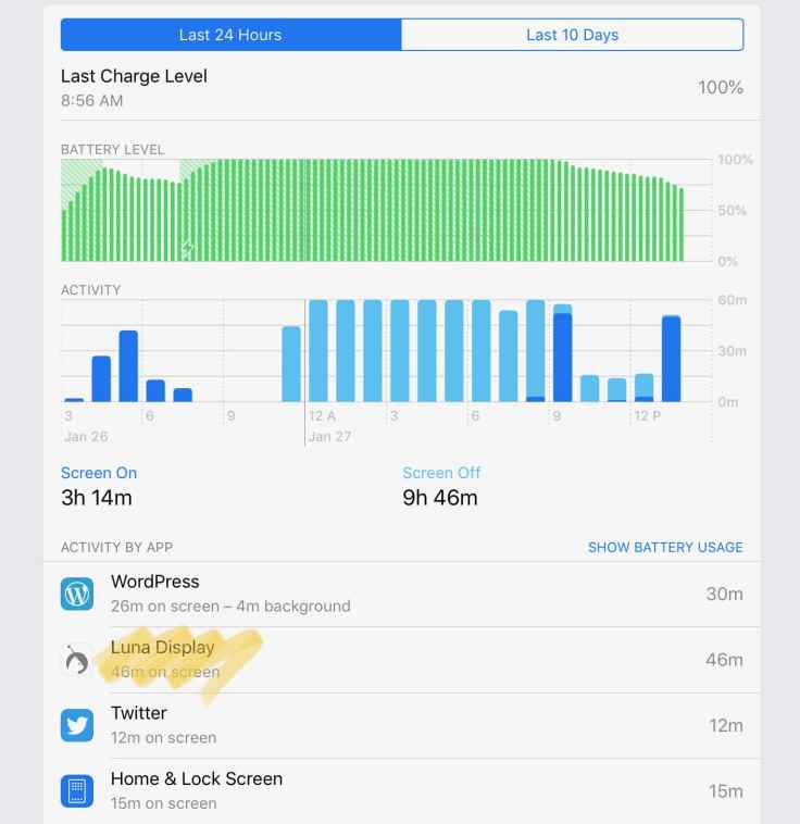 I did experience a few weird flickering screen issues. Applications that open in a specific virtual desktop will cause the Mac display to flicker but that will go away after a few moments. This will probably require a software update. Power consumption on the iPad is quite low and the processing power on my iMac was around 4%. Switching apps on the iPad won’t cause any problem except if iOS or yourself decides to kill the application from the memory. Re opening the Luna Display app on the iPad it will cause flickeing too. I don’t see this as an issue though.