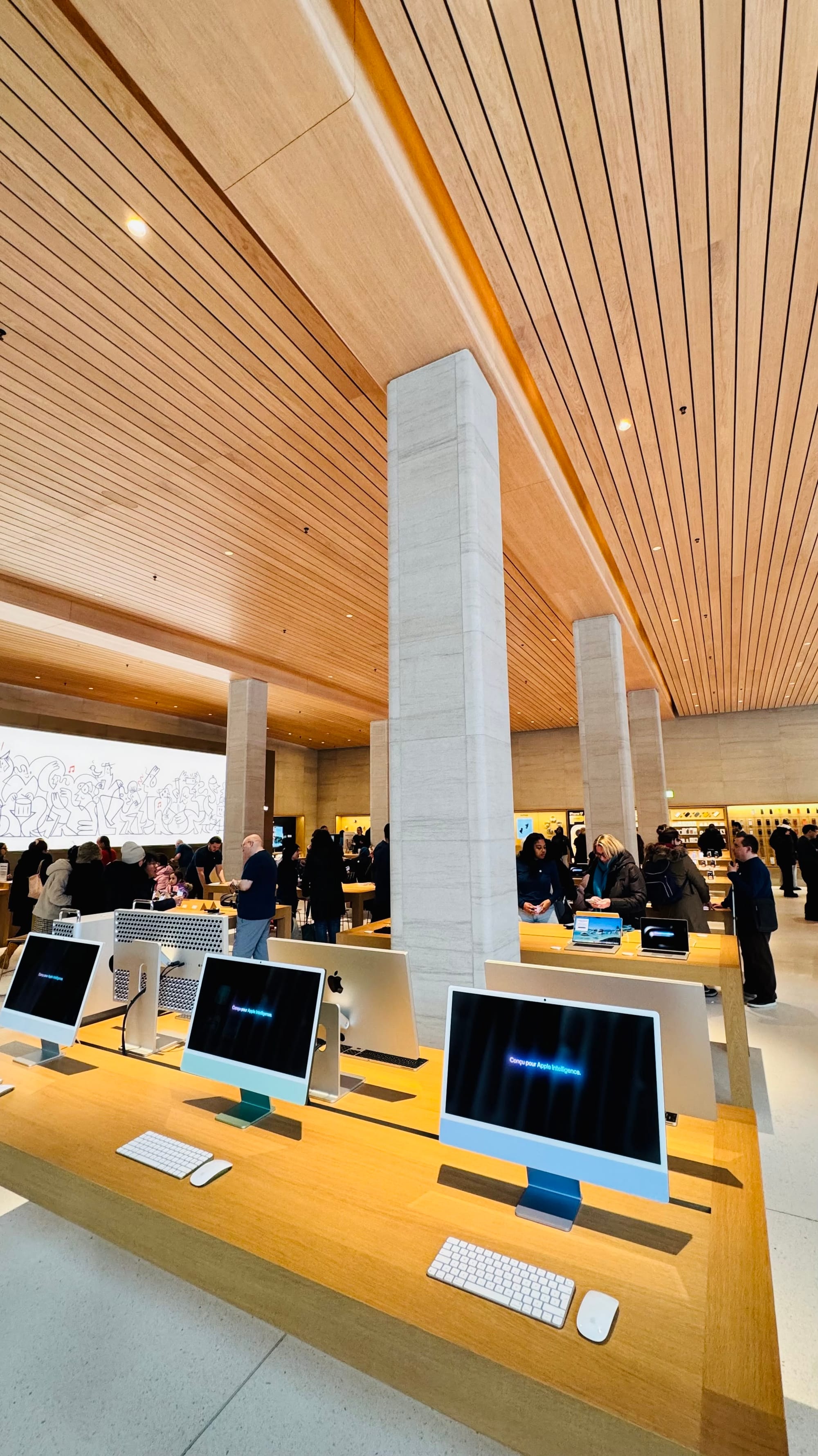 I think Apple's commissioned architects did a great job restoring the building. There's a strong sense of humility and honesty in the material choices. The wooden ceiling helps keep the sound level acceptable, toned down a bit. Apparently, Apple chose local materials.