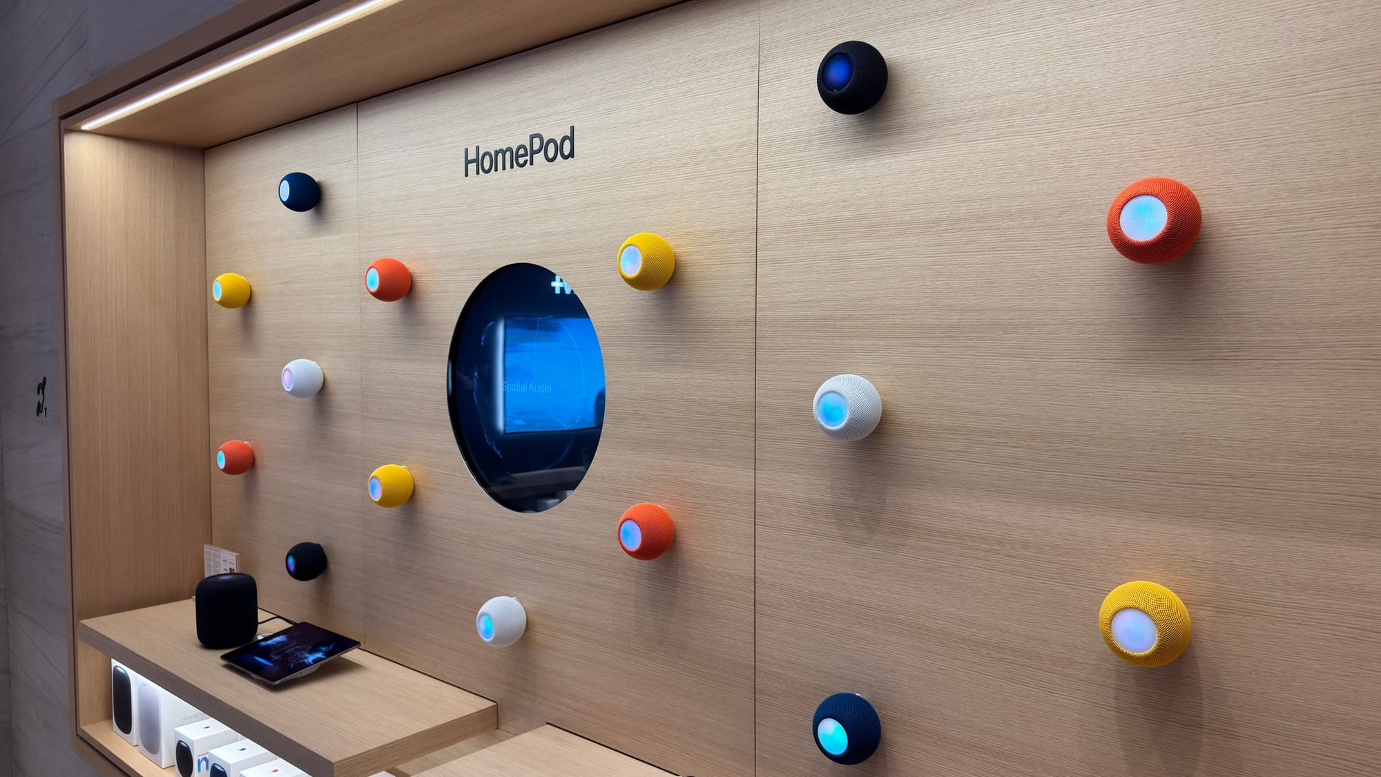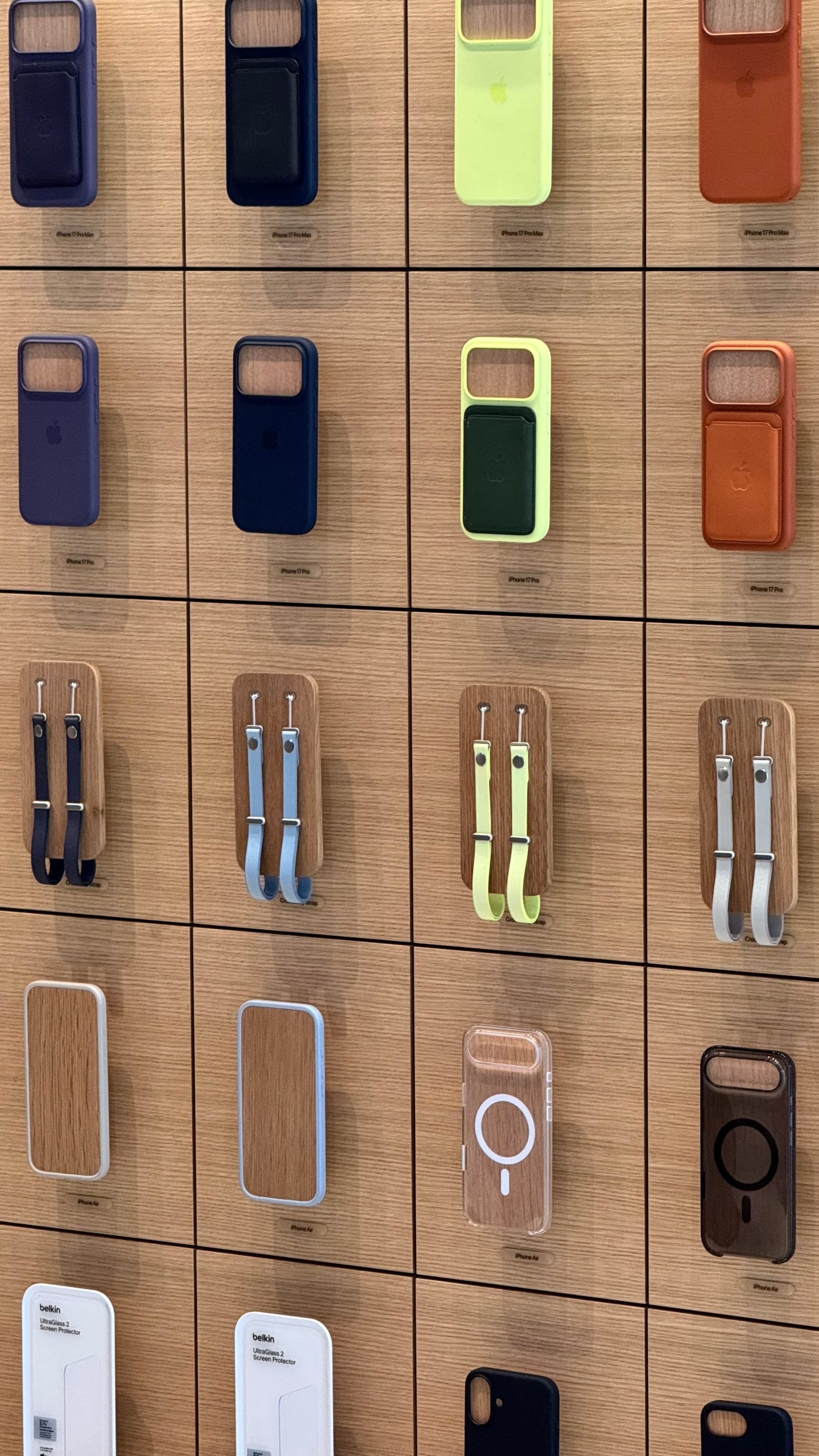 The place looks less busy, too, from a product display perspective. Accessories are well organized on a few stations along the store's exterior walls, while devices are on the classic wood tables, symmetrically placed in the store's main area.