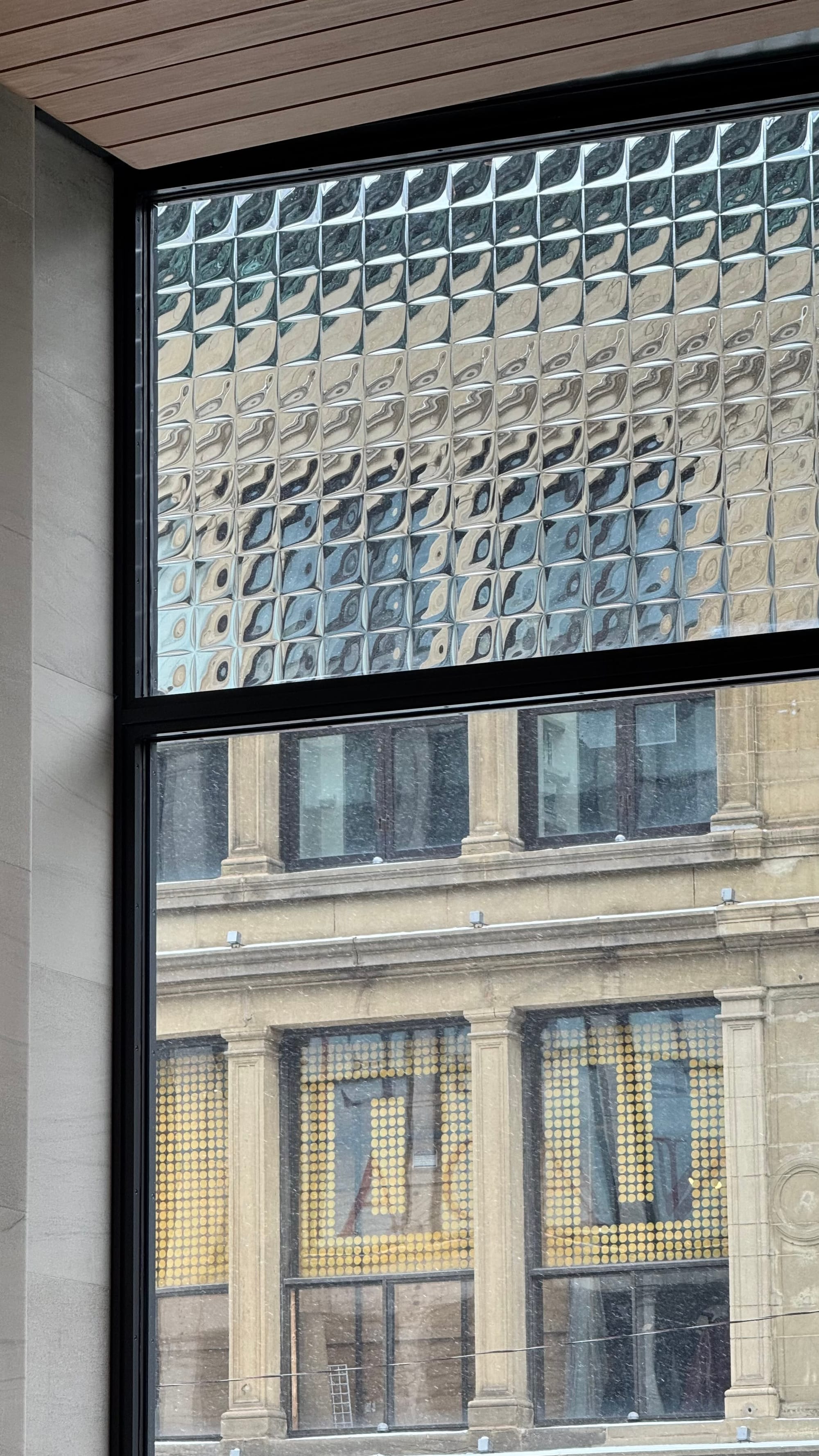 The windows are tall, with a small portion at the top embossed with a pattern that adds a nice mid-century touch to the look. The lighting is just right, nothing too intense, helping keep the calmness of the design.
