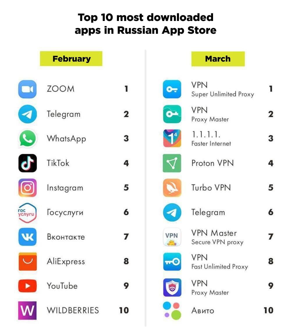 1️⃣ What are the most popular applications on the Russian App Store these days? VPN clients. Somehow, I find this comforting that some people in Russia are intelligent enough to try to see what’s behind the iron curtain imposed by the Russian government. Will it make a difference? The jury is still out.