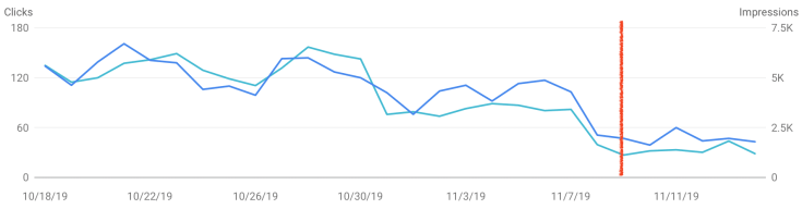 Losing 50% of organic traffic There is something wrong with my blog visitor statistics since November 8. I didn’t know what it is until yesterday. I could not recall any change in my writing habits or in any WordPress settings. Google Search console did show a clear drop on that day. Twitter could n