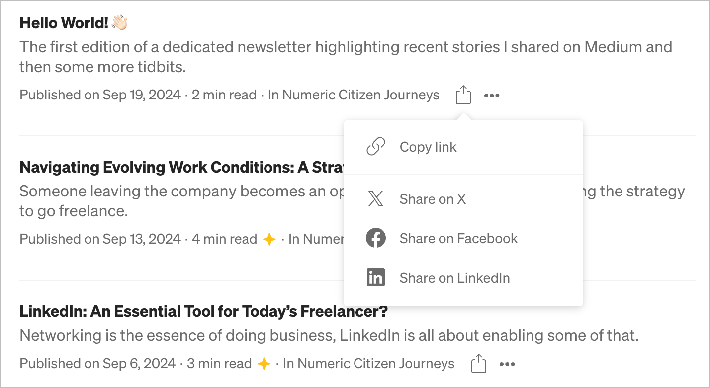 Each story can be individually shared on X, Facebook or LinkedIn, but not on Mastodon or Bluesky. Many publishing platforms settle for the most popular social networks. Come on, Medium, it’s 2024! How could they skip Mastodon? Medium does offer their instance! How strange this is.
