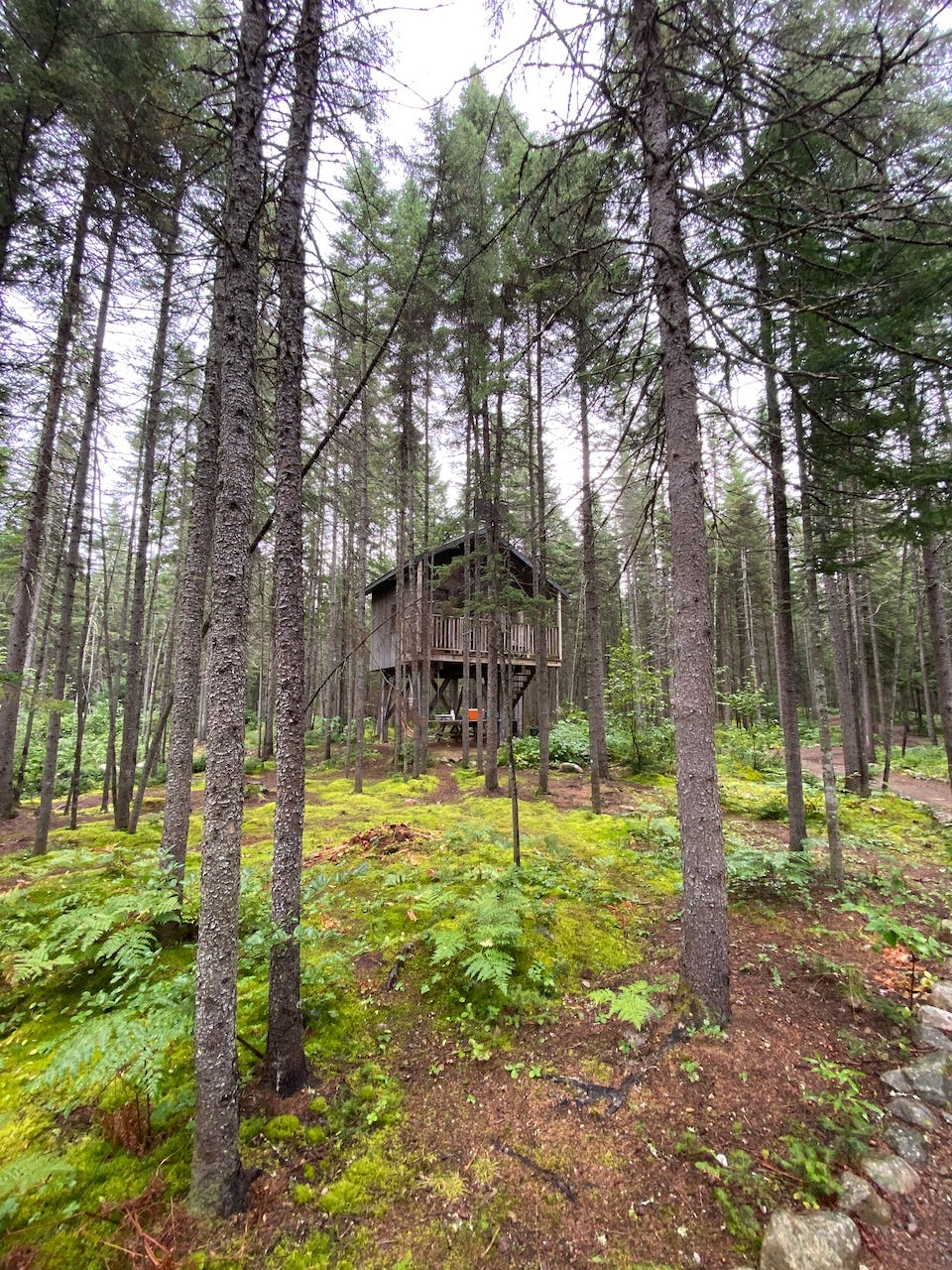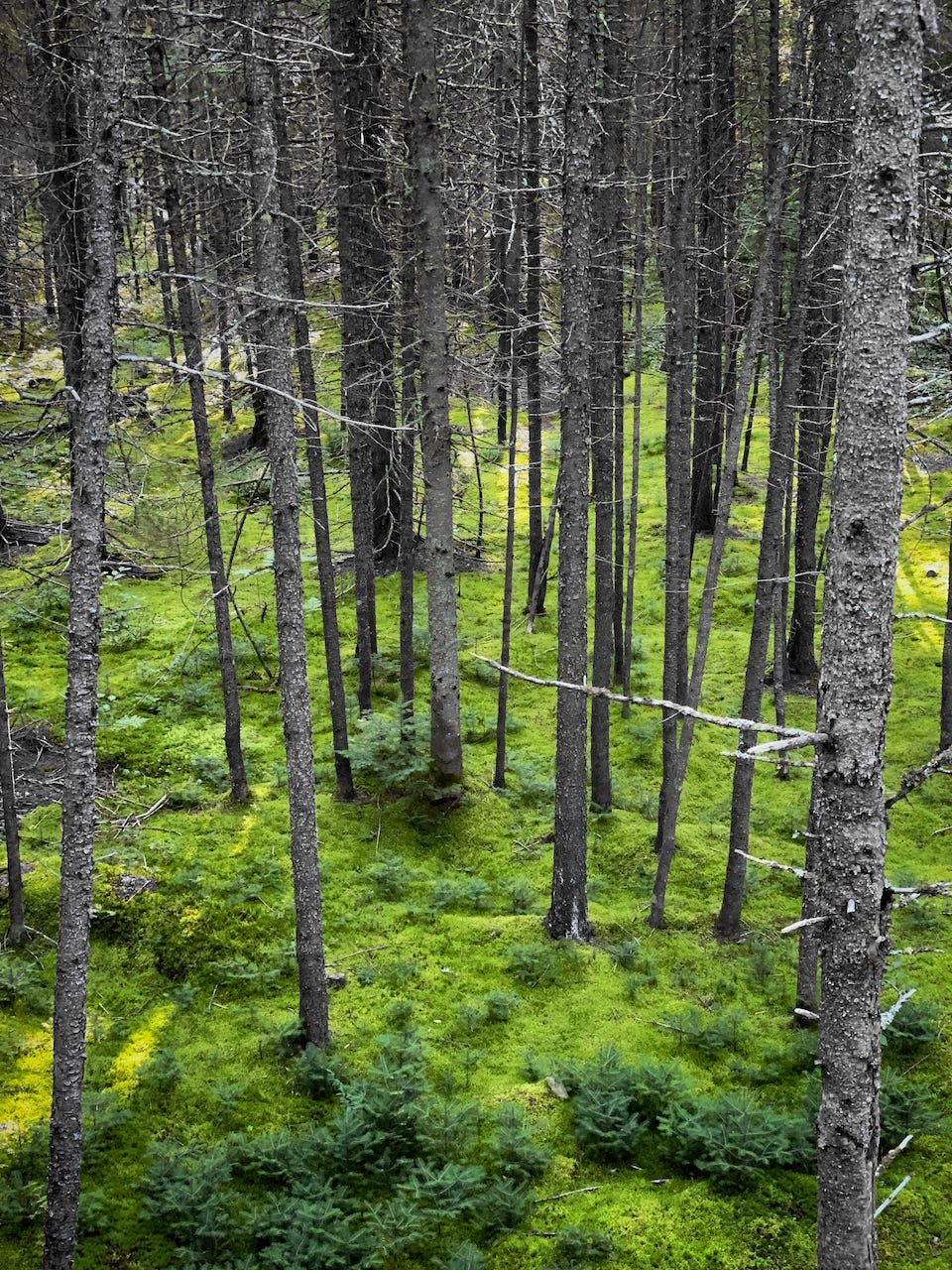 It was a wonderful early September day where summer is beginning to show signs of decline while signs of fall are pointing to the horizon. The weather was mild during the day but chilly during the night. The smell of the forest was so good, making me feel connected to it, being part of it and demanding a contemplative look. Capturing the scene is always part of any of my contemplative moments. This picture was taken from the balcony of my rented cabin where we stayed for the labour weekend, in the middle of the morning. The forest ground was filled with this green carpet; it was surreal, like a movie set in place for the occasion. What a wonderful place.