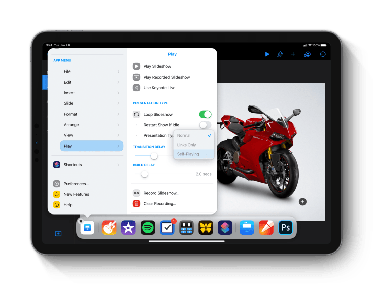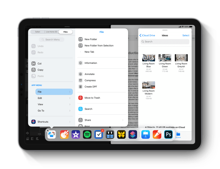 The iPad’s main menu is available from the dock or with a three fingers gesture. It can be invoked at any time. The beauty of this concept is to keep iPadOS simple and mainly unchanged. The iPad dock gets a new icon on the left; that is it. For keyboard users, menu items come with shortcuts, just like on macOS. Each menu items come with colour-coded mini-icons on the left of menu items, which make it more user-friendly, an important attribute of the iPad.