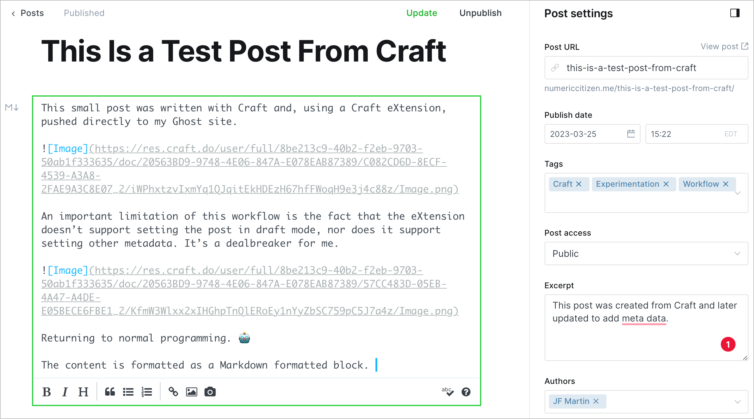 The content is formatted as a Markdown-formatted block. The post header set in Craft wasn't uploaded either.